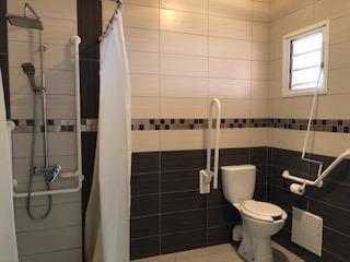 - Une salle de bain facile d'accès, avec des aménagements adaptés : douche italienne, siège amovible, barres de maintien, wc, porte à encadrement large et coulissante.